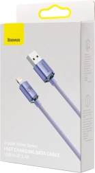 Stílusos és tartós lila USB kábel Baseus Crystal Shine, ideális gyors és biztonságos töltéshez és adatátvitelhez. Támogatja a 2,4A áramerősséget.