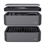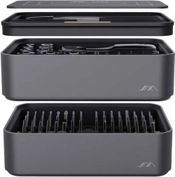 A készlet átgondoltan három modulra van osztva, amelyek összeillesztve egy kisméretű, könnyen hordozható tokot alkotnak. A tartós ABS anyagú, fémes lakkozású tok kiválóan védi a szerszámokat, és elfér hátizsákban, autóban vagy szerszámosládában. A felső szinten mágneses alátét található rekeszekkel, amely megakadályozza a csavarok elvesztését és segít azok áttekinthető rendszerezésében.