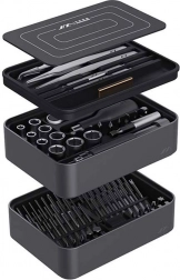 A precíz és kíméletes elektronikai munkákhoz a készlet 3 féle csipeszt és 2 ék alakú bontó lapátot tartalmaz a készülékek biztonságos, karcolásmentes felnyitásához. A következő szinten megtalálható a racsnis kulcs, a csavarhúzó markolat, adapterek és praktikus toldatok. Elérhetők 5–13 mm-es dugókulcsfejek, valamint 8 alap 6,35 mm-es bit (H5, H4, H3, 5PH2, 5PH1, 3PH1, SL5, SL3).