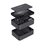 Az alsó rétegben 48 db 4 mm-es bit és 20 db 6,35 mm-es bit kapott helyet. Egy okos gomb a biteket felnyomja a könnyű kivételhez, alattuk csavartartó edény és praktikus mágnesesítő/demagnetizáló található. A széles tartozékválasztéknak köszönhetően biztos lehet benne, hogy a szerelést, szétszerelést és a finom szervizmunkákat is a lehető legnagyobb pontossággal végzi.