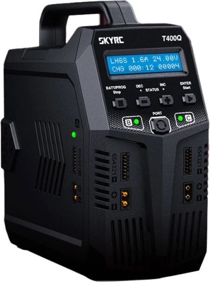 A nagy teljesítményű, négycsatornás SKYRC T400Q töltő modellezőknek lehetővé teszi akár 4 akkumulátor egyidejű töltését csatornánként 100 W teljesítménnyel és akár 12 A áramerősséggel. Széles akkumulátortámogatást kínál (LiPo, LiIon, LiHV, LiFe, NiMH, NiCd, Pb), AUTO módot, fordított polaritás elleni védelmet (XT60), alacsony hőmérsékletű töltési funkciót, valamint nagyon egyszerű kezelést LCD kijelzővel.