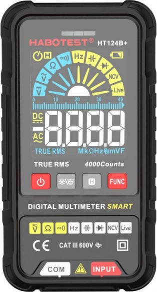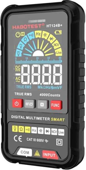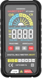 A HABOTEST HT124B+ széles funkciókészletet és EN61010-1, CAT III 600 V biztonsági szabványokat egyesít. A 130 × 70 × 23 mm-es kompakt méreteknek és a 125 g-os tömegnek köszönhetően jól kézben tartható és könnyen elfér a szerszámtáskában. A puha, ütésálló tok növeli a tartósságot és a szigetelést, míg a nagy, háttérvilágított kijelző kiváló leolvashatóságot biztosít.