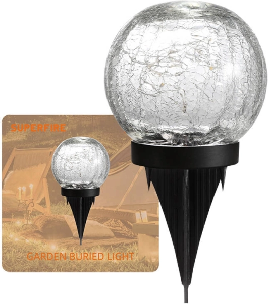 A SUPERFIRE stílusos gömb alakú napelemes lámpája alkonyérzékelővel automatikus világítást biztosít sötétedés után, energiatakarékos, és az IP65 vízálló védelemnek köszönhetően időjárásálló. Nappal a napfény tölti, 600 mAh-s akkumulátora pedig kellemes fényt ad áramköltség nélkül.