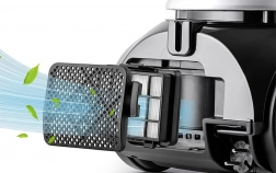 A nagy teljesítményű motor 600 W bemeneti teljesítménnyel és 130 W szívóerővel megbirkózik a porral, morzsákkal, szőrrel és a szőnyegekben megbúvó szennyeződésekkel is. A fejlett HEPA 12 szűrő a nagyon finom részecskéket is megfogja, így az otthoni levegő tisztább és frissebb lesz. A porszívó csendesen működik (kb. 68 dB), ezért nem zavarja a családot vagy a házi kedvenceket.