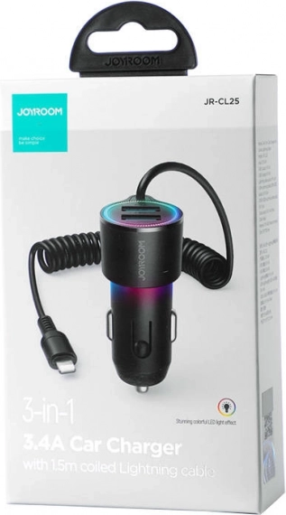 Joyroom autós töltő gyors és hatékony töltést biztosít utazás alatt, akár 17 W teljesítménnyel. A két USB port és a Lightning kábel lehetővé teszi akár három eszköz egyidejű töltését. Élvezze a gyors töltést az akár 3A áramerősségnek köszönhetően.