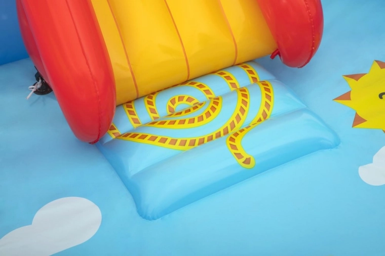 A játszóközpont a vizes mókát mozgással és játékokkal ötvözi: a gyerekek lecsúsznak az eltávolítható csúszdán, kipróbálják a patkóra célzott karikadobást, és lovagolnak a felfújható lovacskán. Játék után egyszerűen leereszti a vizet, és a medencét könnyen elpakolja. A csomag tartalmaz javítófoltot a hosszabb élettartamért.