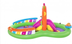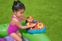 Fedezze fel és élvezze a rengeteg szórakoztató funkciót a Sing and Splash felfújható vizes játszóközponttal. A játszóközpont mikrofont és dobot tartalmaz, amelyekkel a gyerekek játszhatnak, így szabadjára engedhetik fantáziájukat. A dupla medencéket eltávolítható, kötelekkel és fülekkel rögzített csúszda köti össze. A padlóba épített felfújható párna puha landolást biztosít a csúszdáról. A beépített permetezővel ellátott ívet elég a kerti tömlőhöz csatlakoztatni. Az ív tüskéire felfújható karikákat lehet dobálni. A szett része 6 színes labda, amelyeket leengedhet az egyik vagy a másik rámpán. Ezek a játékok nemcsak szórakoztatók, hanem fejlesztik a kéz-szem koordinációt is.
