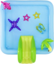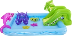 Változtasd a nyári napokat kalanddá! Ez a színes, tengeri motívumokkal díszített vízi játszótér a 2 éves kortól ajánlott gyerekek kedvence lesz – csúszda vezet a medencébe, a kerti locsolócső csatlakoztatása után permetező szökőkút működik, és egy felfújható állatka készlet serkenti a képzeletet és a mozgást.