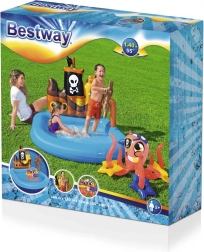 Változtassa a kertet egy kis vízi királysággá. Ez a BESTWAY felfújható kalózos játszótér kék medencével, hajódísszel, forgatható kormánnyal, dobókarikákkal/csillagokkal és vidám polippal kínál szórakozást. Tartós PVC anyagból készült, könnyen felállítható, és ideális a legkisebbek számára biztonságos vízi mókához.