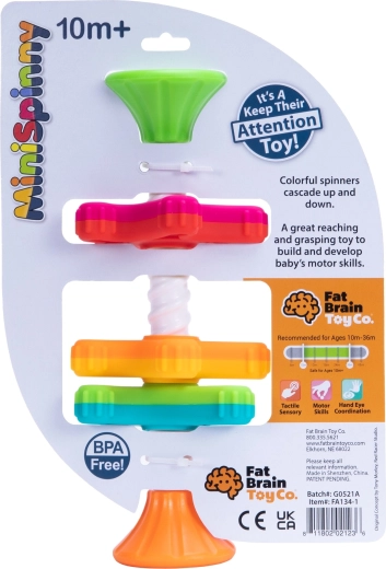 A MiniSpinny okos érzékszervi játék, amely mozgással, színekkel és tapintással köti le a gyermek figyelmét. Három, eltérő számú „lábacskával” ellátott tárcsa forog simán a spirál rúdon, lecsúszás közben pedig lenyűgöző vizuális hatást kelt. A texturált felületek felfedezésre hívnak, és természetes módon fejlesztik a tapintást és a koordinációt.