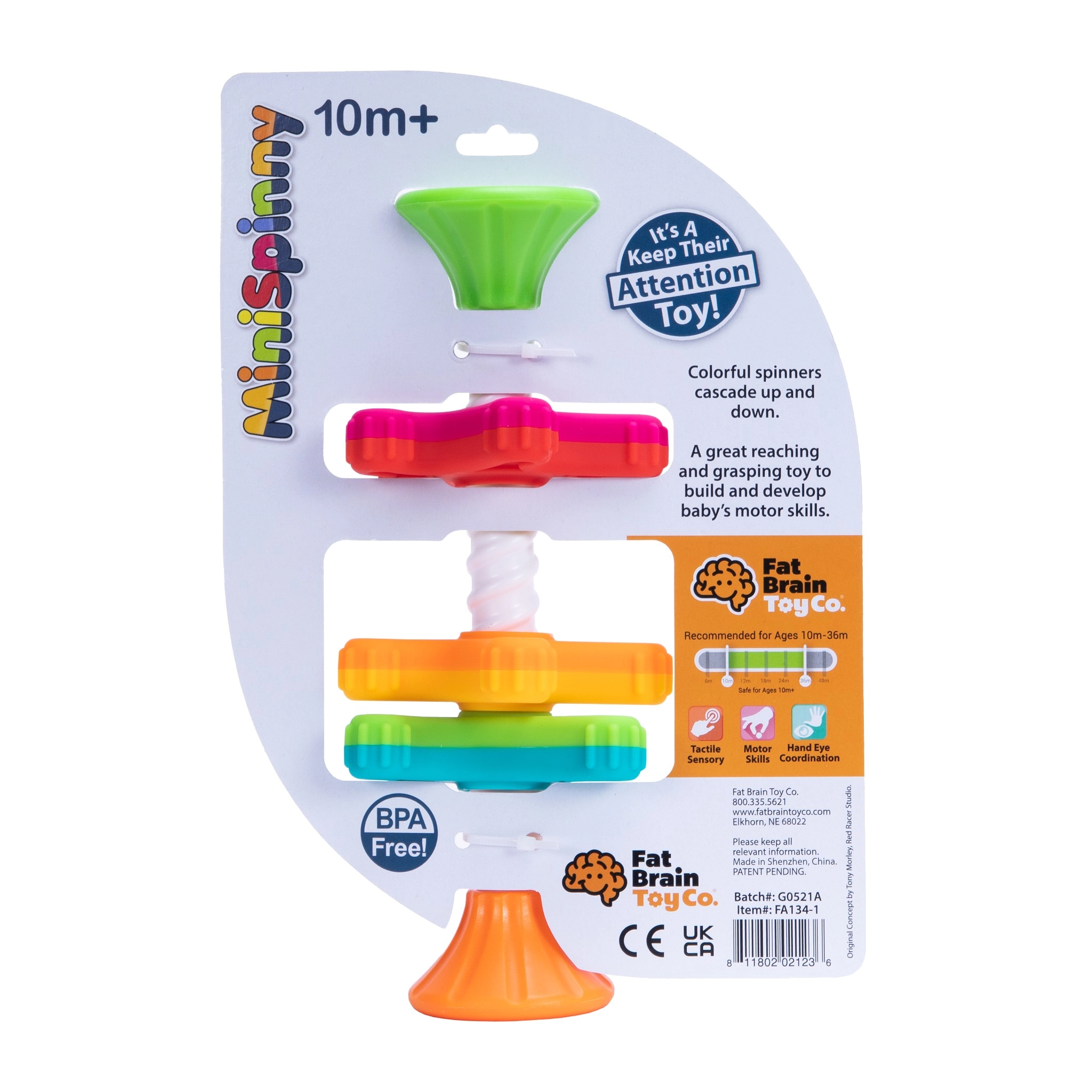 A tapadókorongnak köszönhetően a játék könnyen rögzíthető asztalra, etetőszék tálcájára vagy ablakra – semmi nem vész el, az elemek együtt maradnak. A MiniSpinny otthon, útközben és a fürdőszobában is remek választás. BPA- és ftalátmentes, biztonságos műanyagból készül a gondtalan játékért.