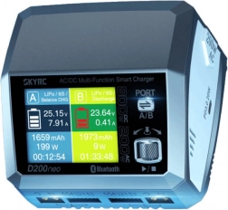 A nagy teljesítményű, kettős SKYRC D200neo töltő villámgyors és biztonságos töltést kínál akár 35 A árammal, 200 W AC vagy akár 800 W DC teljesítménnyel. Két független portot, intelligens teljesítménymegosztást, színes 2,8" kijelzőt és modern USB‑C Power Deliveryt nyújt a hatékony töltéshez és PC/Mac-es kezeléshez.