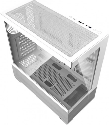 A ház támogatja az ATX, M-ATX és ITX alaplapokat, bőséges helyet kínál a modern videokártyáknak (akár 425 mm) és a toronyhűtőknek 170 mm-ig. A rugalmas tárhely 2× 3,5" HDD-t és 2× 2,5" SSD-t fogad, míg az alsó tápegység‑pozíció tiszta kábelmenedzsmentet biztosít. A felső panel gyors hozzáférést ad az USB‑C, USB 3.0, USB 2.0, HD Audio csatlakozókhoz és a vezérlőgombokhoz.