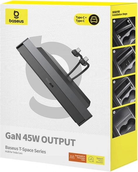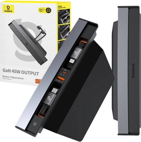 A Baseus T‑Space egy elegáns és funkcionális elosztó, amelyet kifejezetten a Tesla járművek belső teréhez terveztek. Kényelmesen tölthet vele akár négy eszközt egyszerre – két kihúzható USB‑C kábel (0,8 m) az első és hátsó utasok számára, kiegészítve egy USB‑C és egy USB‑A csatlakozóval. A GaN technológiának és akár 45 W teljesítménynek köszönhetően gyors és stabil töltést biztosít túlmelegedés nélkül.