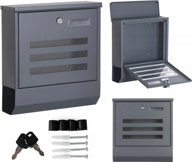 Az elegáns ModernHome postaláda horganyzott acélból, antracit árnyalatban ellenáll a korróziónak és az időjárásnak. Kínál újságtartó tubust, ellenőrző ablakokat, tömített kialakítást, valamint egyszerű szerelést homlokzatra és kerítésre. A csomagban szerelési tiplik és 2 kulcs található.