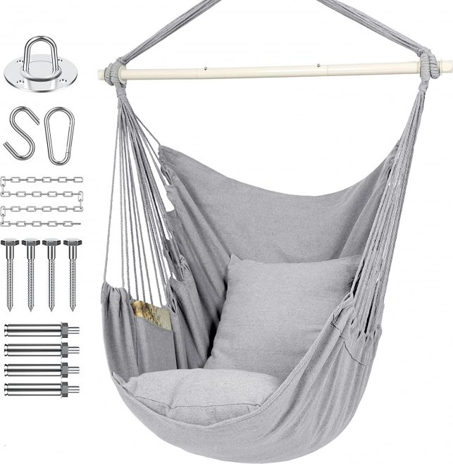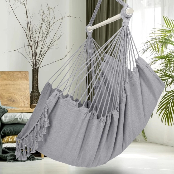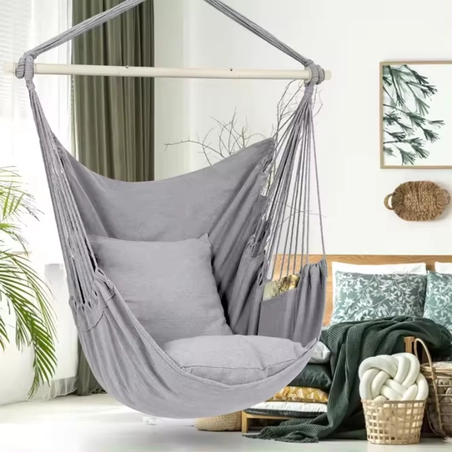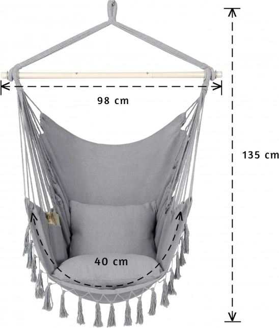Anyag: A hinta kiváló minőségű, otthoni használatra is alkalmas anyagból készült: pamut kötélből és acélcsőből, ami szilárdságot és tartósságot biztosít.