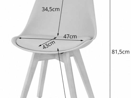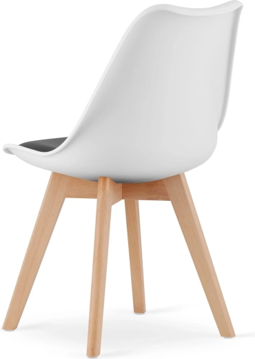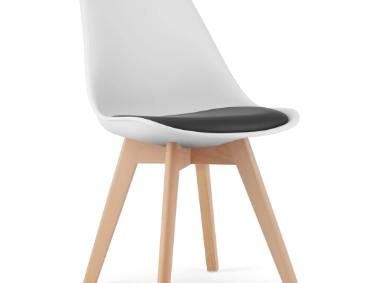 - A székek fekete és fehér színben érhetők el, természetes fa árnyalatú lábakkal.