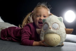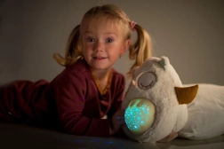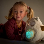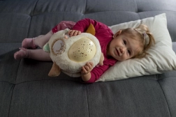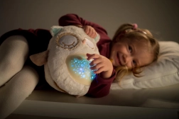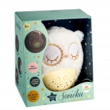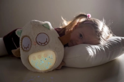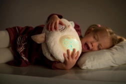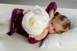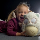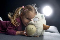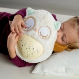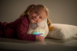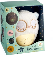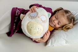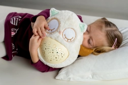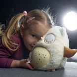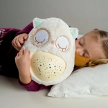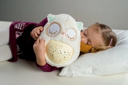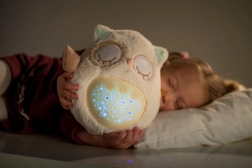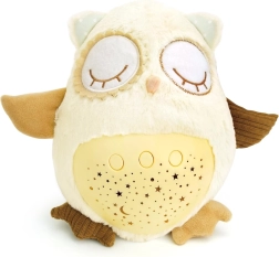 Ez a pihe-puha plüss alvókás a meleg ölelést okos altató funkciókkal ötvözi. A bagoly 8 színben vetíti a csillagos égboltot, 8 altatódalt és megnyugtató prenatális hangokat játszik le, amelyeket a legkisebbek az édesanya pocakjából ismerősnek éreznek. A dallam lejátszása után még körülbelül egy percig finoman világít, majd automatikusan kikapcsol.