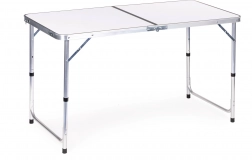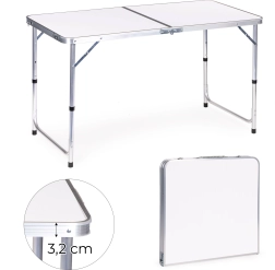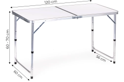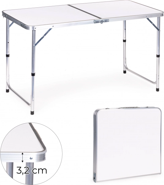 Praktikus, összecsukható MultiGarden túraasztal fehér, 120 × 60 cm-es lappal – ideális kempinghez, kertbe és piknikhez. Kínál 60/70 cm állítható magasságot, könnyű és erős szerkezetet akaratlan összecsukódás elleni védelemmel, valamint gyors, fogantyús bőröndméretre hajtható kialakítást. Kényelmesen kiszolgál akár 4 főt, és 50 kg teherbírású.