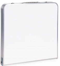 Az asztal pillanatok alatt összehajtható kompakt, praktikus fogantyúval ellátott bőrönddé, így minimális helyet foglal az autó csomagtartójában és otthon is. A stabil fém váz, a csúszásgátló lábvégek és a véletlen összecsukódás elleni retesz biztonságos használatot garantálnak.