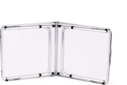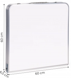 A lábakat egyszerűen behajtva az asztal lapos, fogantyús bőrönddé alakul. Az összehajtott méret, 60 × 60 cm, helyet spórol az autó csomagtartójában és otthoni tároláskor is.