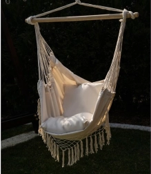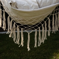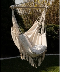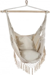 Ez a kényelmes, függő hamakfotel új szintre emeli a relaxációt. A pamut és a poliészter kombinációjának köszönhetően az anyag kellemes tapintású, ugyanakkor erős és tartós. A fa távtartó rúd és az egyenletesen vezetett kötelek stabil pozíciót és könnyű felfüggesztést biztosítanak.