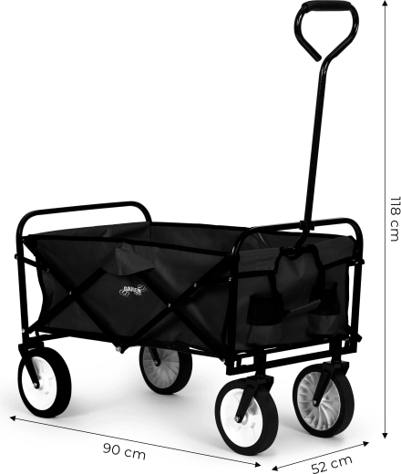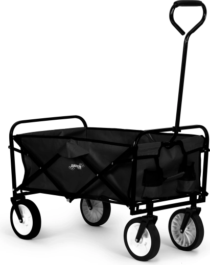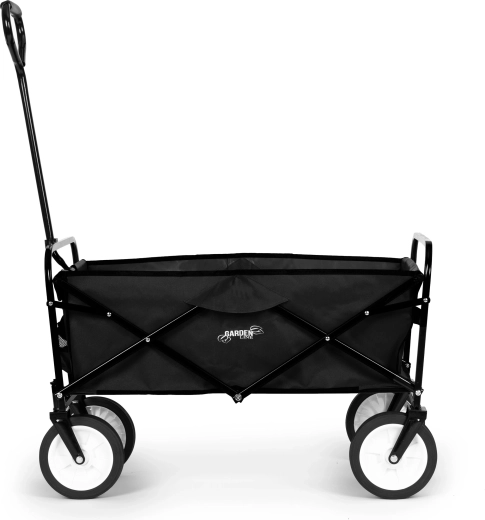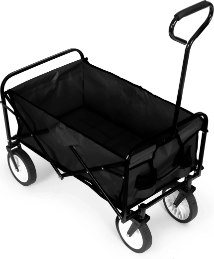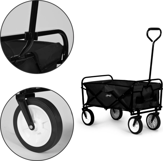Megbízható segítőt keres a kertbe, nyaralóba vagy a mindennapokra? Ez a fekete összecsukható kerti kocsi a fém váz stabilitását, a tartós textilt és a kerekek sima futását egyesíti. Ideális anyagok, szerszámok vagy akár nagyobb bevásárlás szállítására – minimális erőfeszítéssel.