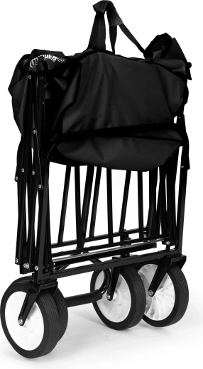 A kocsi 360°-ban forgó kerekekkel rendelkezik a könnyű manőverezésért szűk helyeken is, vízálló anyaggal az időjárástól független használathoz és széles, kényelmes fogantyúval a biztos fogásért. Használat után pillanatok alatt kompakt méretre csukható, így szinte semennyi helyet sem foglal.
