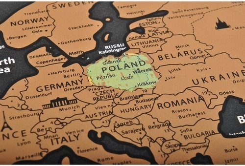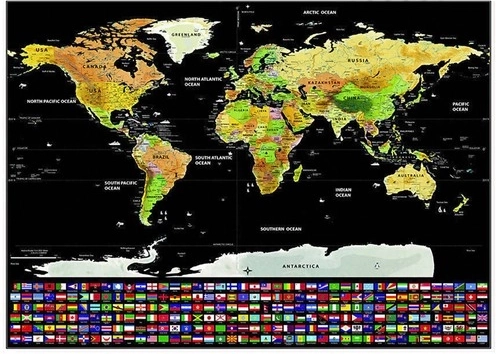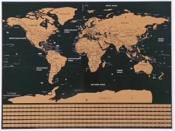 Dekoratív térkép, amely lehetővé teszi az utazók számára, hogy a meglátogatott országokat a felső réteg eltávolításával jelöljék meg. Alatta színes zászlók és az egyes országok részletei jelennek meg.