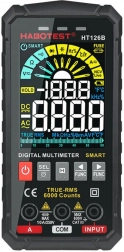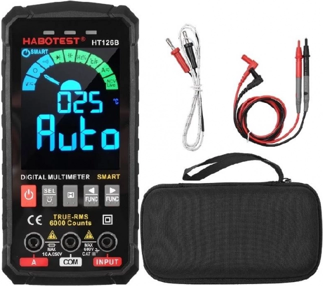A HABOTEST multiméter terepen és műhelyben egyaránt pontos és kényelmes mérést kínál. Dík y true‑RMS a nemlineáris jeleknél is megbízható eredményt ad, a 6000 számlálás finom felbontást, a nagy, háttérvilágított VA kijelző pedig kiváló olvashatóságot biztosít. A szilikon gombok, a LED zseblámpa és a kompakt ház (kb. 146 × 72 × 26 mm, 182 g) a nehezebb körülmények között is növelik a kényelmet.