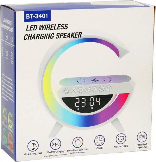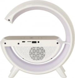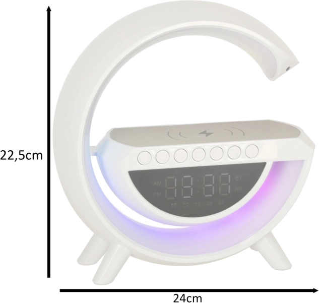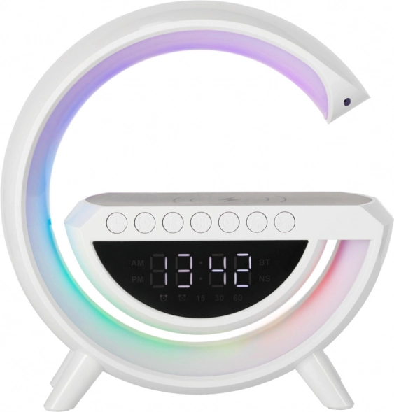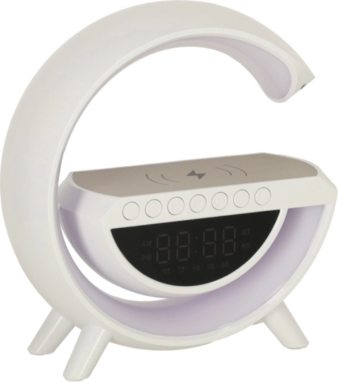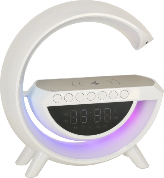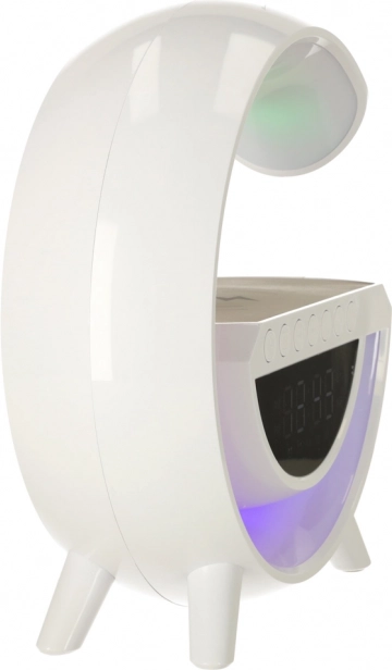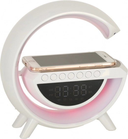A multifunkciós LED RGB lámpa egy stílusos eszközben ötvözi a Qi vezeték nélküli töltőt, a digitális órát ébresztővel, az FM rádiót, a Bluetooth hangszórót és az ambient éjszakai világítást. 7 színt és 13 fényüzemmódot kínál, fehérzaj-generátort a nyugodt alváshoz, valamint kényelmes használatot a beépített akkumulátornak köszönhetően.