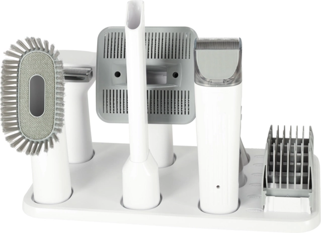 A csomag része egy vezeték nélküli nyírógép hat toldattal (3–23 mm) a pontos formázáshoz, gubancolódás elleni kefék, valamint eszközök a mancsok és karmok ápolásához. A három szívóüzem könnyen igazítható az érzékeny állatokhoz, míg a hatékony szűrő segít csökkenteni az otthoni port és allergéneket.