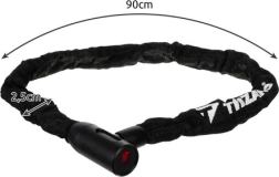 A 90 cm hosszú lánc rugalmas rögzítést kínál fix tárgyakhoz. A 15 kerek szem (Ø 6 mm) kialakítás növeli a vágással és ütésekkel szembeni ellenállást, így nyugodt szívvel biztosíthatod a kerékpárt, rollert vagy babakocsit.