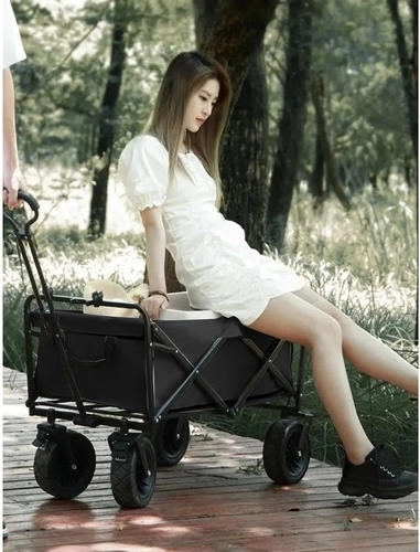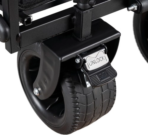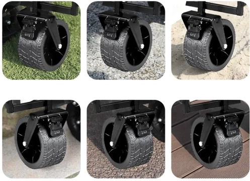 Széles, forgó kerekekA kocsi kiváló minőségű PP anyagból készült, széles, mintázott kerekekkel van felszerelve, amelyekstabilitást és könnyű manőverezhetőséget biztosítanak különböző felületeken. A kocsi elején lévő kerekek teljesen, 360 fokban forgathatók, ami pontos irányítást és könnyű manőverezést tesz lehetővé szűk helyeken. Emellett fékkel/rögzítővel vannak ellátva, amely a rakodás és kirakodás során biztonságot és stabilitást nyújt. A nagy, mintázott kerekeknek köszönhetően akocsi megbirkózik a homokos tengerparttal és a kert laza, egyenetlen terepével is.