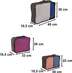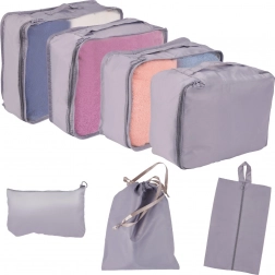 Tarts rendet a poggyászban minden utazás során. Ez a praktikus szett egységes dizájnú, 7 darabból álló rendszerezőt tartalmaz, amelyek megkönnyítik a pakolást és az átláthatóságot. A strapabíró poliészter szövetnek köszönhetően könnyűek, könnyen tisztíthatók, és mindennapi otthoni használatra is alkalmasak. A készlet része egy cipőzsák és egy kisebb tok apróságoknak is. Gyors pakolás, több hely és jobb szervezettség minden bőröndben.