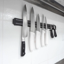 Hosszanti, kettős magos mágnesek tartják stabilan a késeket, ollókat és a kisebb szerszámokat. A tárgyak nem csúsznak le a lécről, biztonságosan a helyükön maradnak.