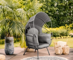 A ModernHome kerti szék luxus időtöltést kínál a friss levegőn puha párnákkal és összehajtható tetővel, amely megvéd a napfénytől és a széltől.