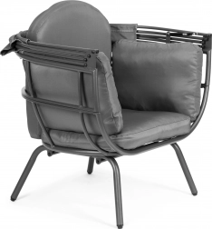 A kerti szék négy párnát tartalmaz, amelyek kényelmesek, időjárásállóak és könnyen tisztíthatóak a levehető cipzáros huzatoknak köszönhetően.