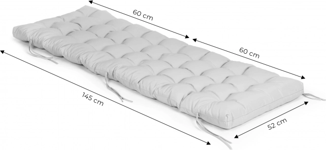 A tartós szövet könnyen karbantartható, kopás- és fakulásálló, és készen áll a kültéri használatra. A négy oldalon végigfutó hosszú rögzítőpántok megakadályozzák az elcsúszást, és pontosan ott tartják a párnát, ahol szükséged van rá. A semleges szürke szín a legtöbb kerti bútorral könnyen kombinálható.
