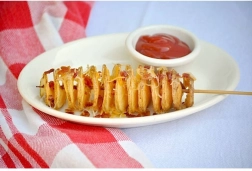Tálalja a spirálburgonyát pálcikán, kedvenc mártogatóssal és fűszerekkel – látványos snack, amely a gyerekeknek és a felnőtteknek is örömet okoz.