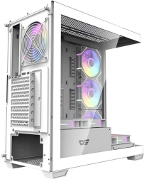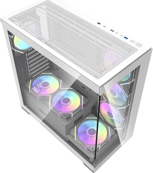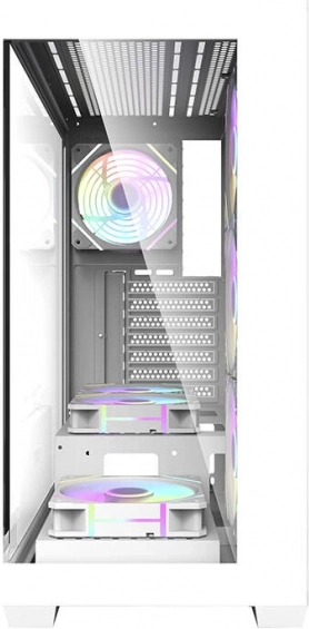 Elegáns és tágas Darkflash DS900 számítógépház fehér színben, panorámás, A-oszlop nélküli kialakítással, két edzett üveg oldallappal és előre szerelt 7× 120 mm ARGB ventilátorral. Kiváló légáramlást biztosít, támogatja a nagy, 360 mm-es radiátorokat, kompatibilis ATX/M‑ATX/ITX alaplapokkal, és könnyű bővíthetőséget kínál a 7 PCI bővítőhelynek és az átgondolt belső elrendezésnek köszönhetően.