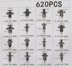 Komplett univerzális készlet autószereléshez és javításhoz: 620 darab klipsz 16 típusban és 18 méretben, háromszintes, fogantyús rendeződobozban tárolva. Tartalmaz 4 műanyag bontófeszítőt és egy ergonomikus nyelű fém kihúzót a gyors, tiszta és biztonságos burkolat-, doblemez- és lökhárító-bontáshoz. Tartós PP/ABS és fém anyagok a hosszú élettartamért és megbízható rögzítésért.