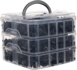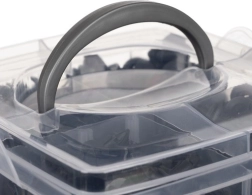 Praktikus doboz átlátszó szintekkel és rögzítőcsatokkal, amelyek rendezetten és biztonságosan tartják a klipszeket. Könnyű hordozhatóság a masszív fogantyúnak köszönhetően.