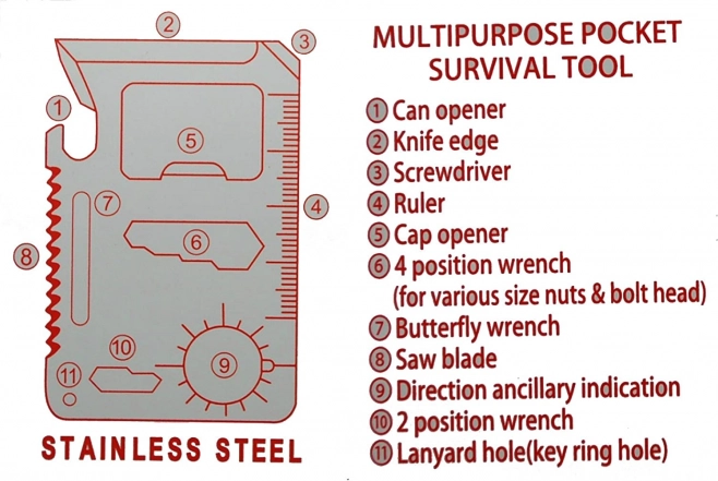 A Bear Grylls túlélési kártya elengedhetetlen segítő minden túrán. Kompakt és tartós kialakítása rozsdamentes acélból készült, amely garantálja a hosszú élettartamot és a könnyű hordozhatóságot. Ideális kempingezéshez, kirándulásokhoz, táboroztatáshoz vagy akár csak az autóban vészhelyzet esetére.