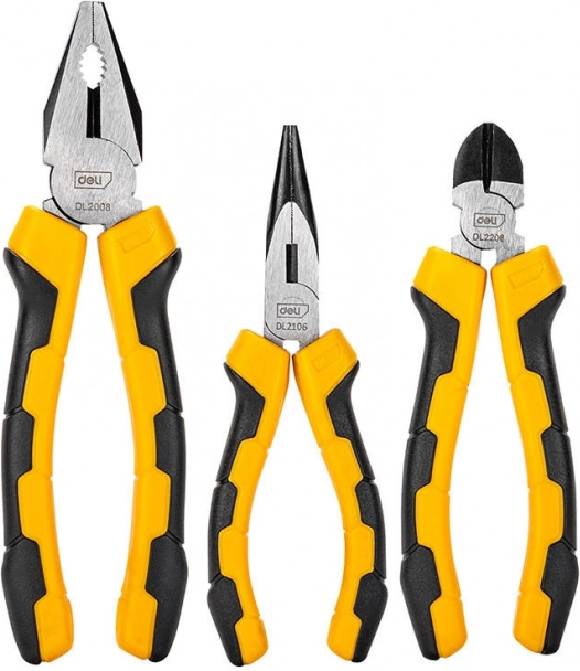 A DELI háromrészes fogókészlet ideális műhelybe, háztartásba és szervizbe. A magas széntartalmú acélból készült, minőségi felépítés kopásállóságot garantál, míg a csúszásmentes sárga-fekete markolatok biztos fogást és kényelmet a hosszan tartó használat során nyújtanak.