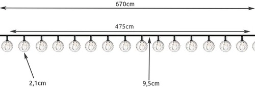A füzér meleg sárga fényt áraszt, ami ideális hangulati világításhoz. A golyók 9,5 cm távolságra helyezkednek el egymástól egy hosszú zöld kábelen, ami szinte észrevétlenül beleolvad a környező zöld növényzetbe.