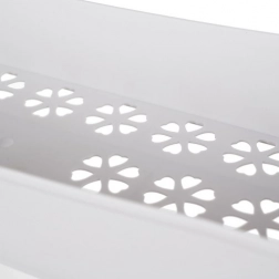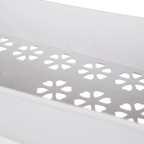 A pontos illesztésű rozsdamentes acél kötések és a minőségi PP kombinációja stabilitást és hosszú élettartamot garantál. A virágmintás perforált polcalj nemcsak feldobja az enteriőrt, hanem javítja a nedvesség elvezetését is. A négy forgó kerék lehetővé teszi a könnyed áthelyezést szűk helyeken is, a praktikus oldalsó akasztók pedig kéznél tartják a törlőkendőket, szivacsokat vagy keféket.