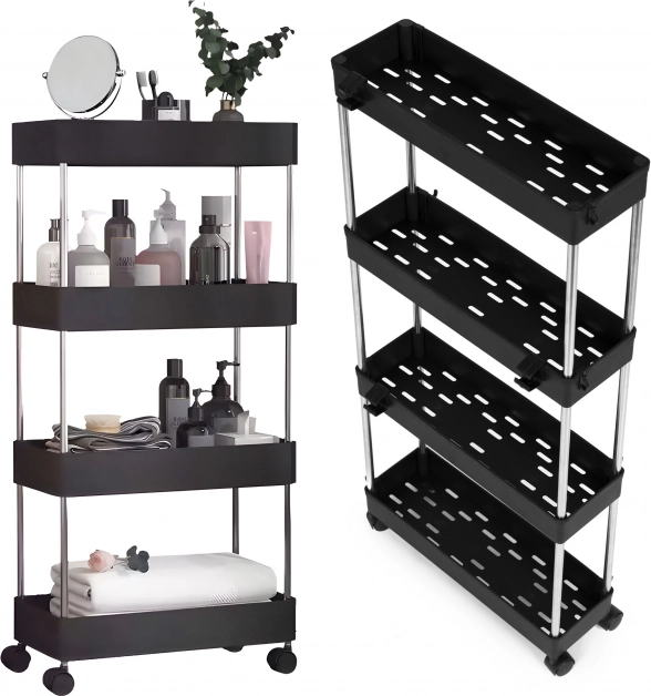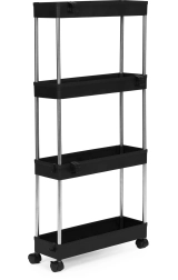Tartson rendet a szűk helyeken is. Ez a keskeny, műanyag ModernHome állvány bőséges tárolóhelyet kínál 4 polcon kozmetikumoknak, törölközőknek, tisztítószereknek vagy élelmiszereknek. A karcsú profilnak köszönhetően remekül befér szekrények közé, a mosógép mellé vagy a zuhanykabin mellé.