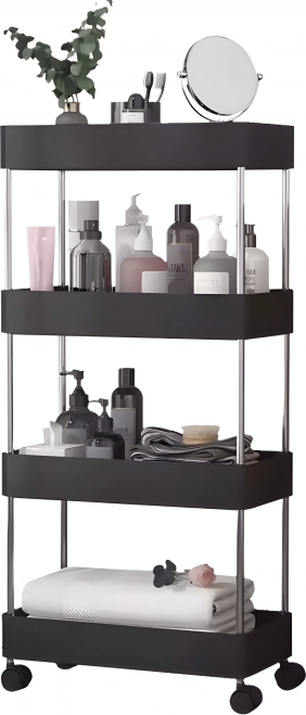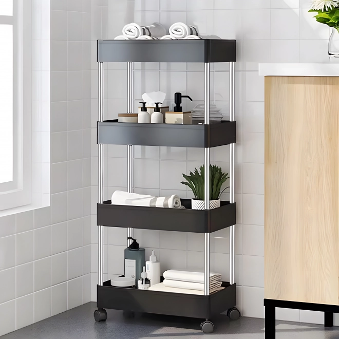 Négy praktikus polc biztosít elegendő helyet szűkebb terekben is – ideális kozmetikumokhoz, törölközőkhöz vagy tisztítószerekhez.