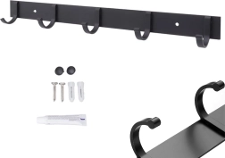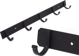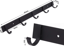 Praktikus fali fogas 5 akasztóval, tartós fekete fémből, amely átláthatóan egy helyen tartja a törölközőket, köntösöket és táskákat. A kompakt, 38,5 cm szélesség helyet takarít meg, és remekül illik a fürdőszobába vagy az előszobába. A csomag része egy szerelőkészlet az egyszerű felszereléshez.